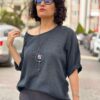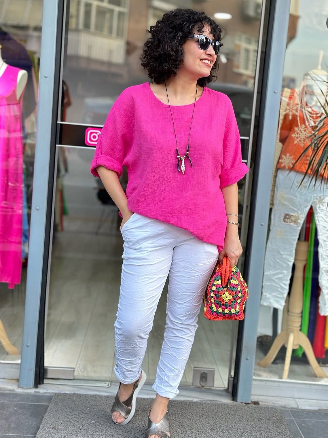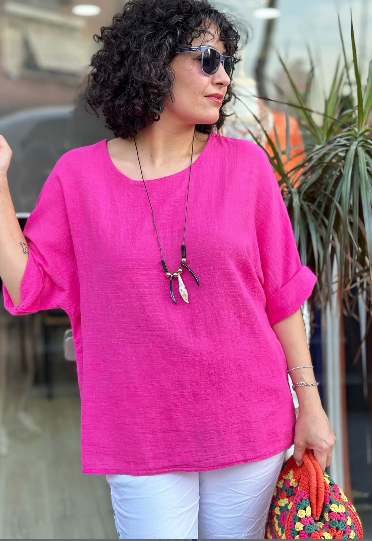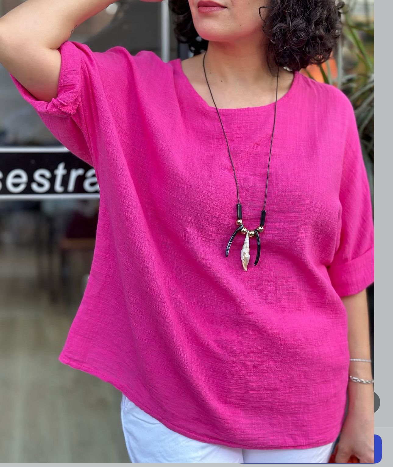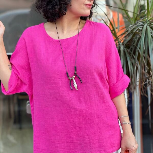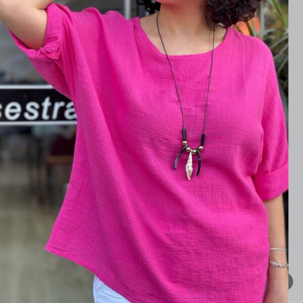 İtalyan Kolyeli Pamuk Keten Fuşya Bluz