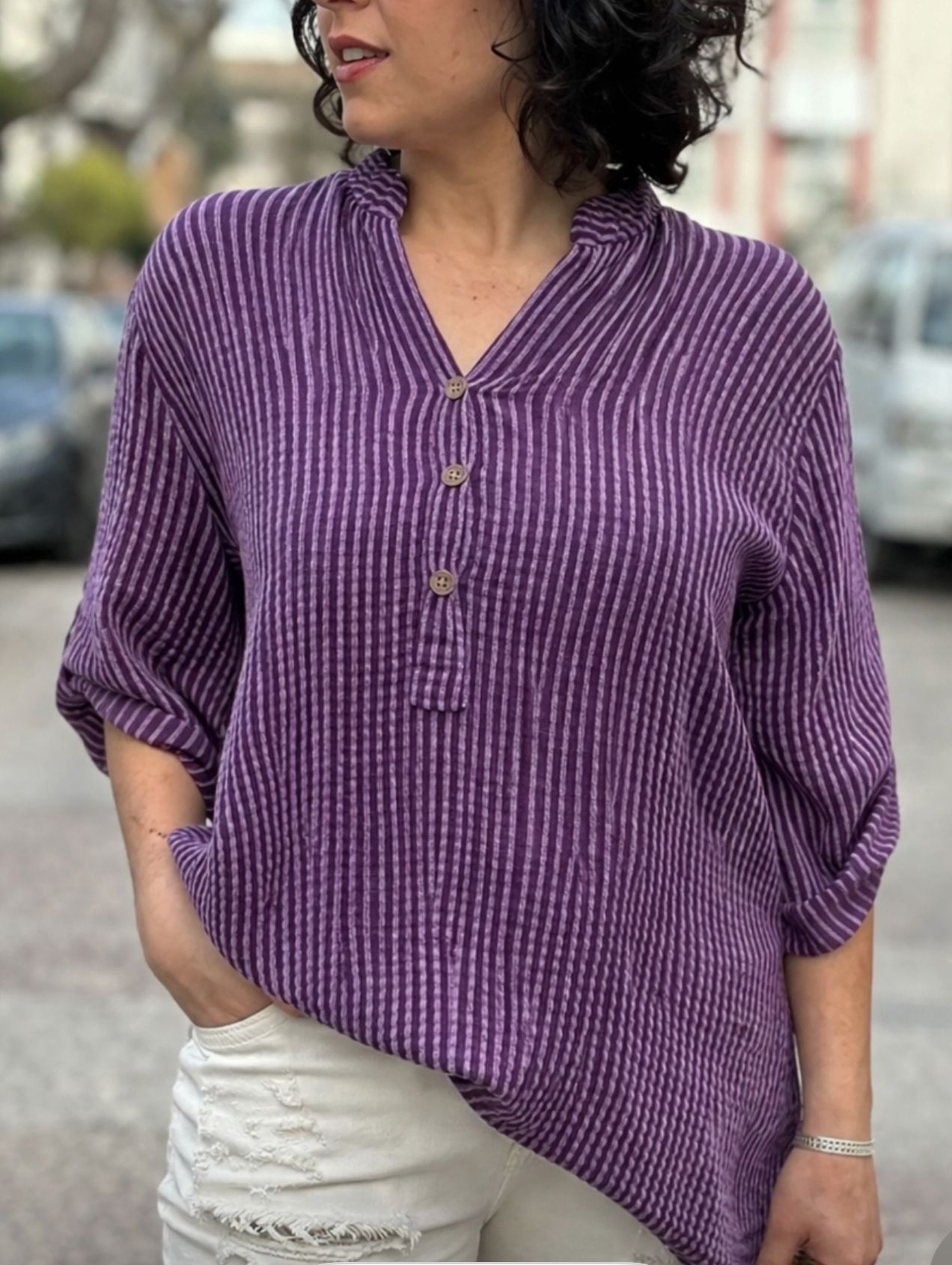 İtalyan Tasarım Çizgili Mor Gömlek