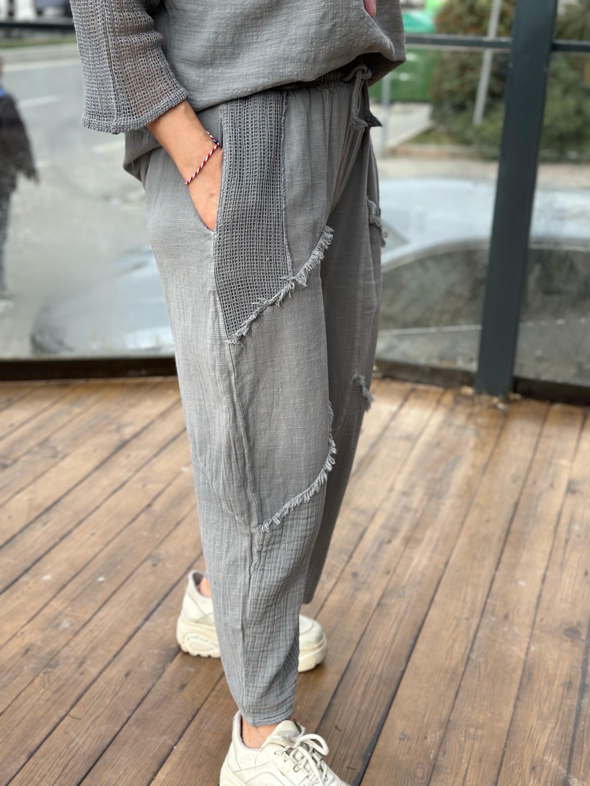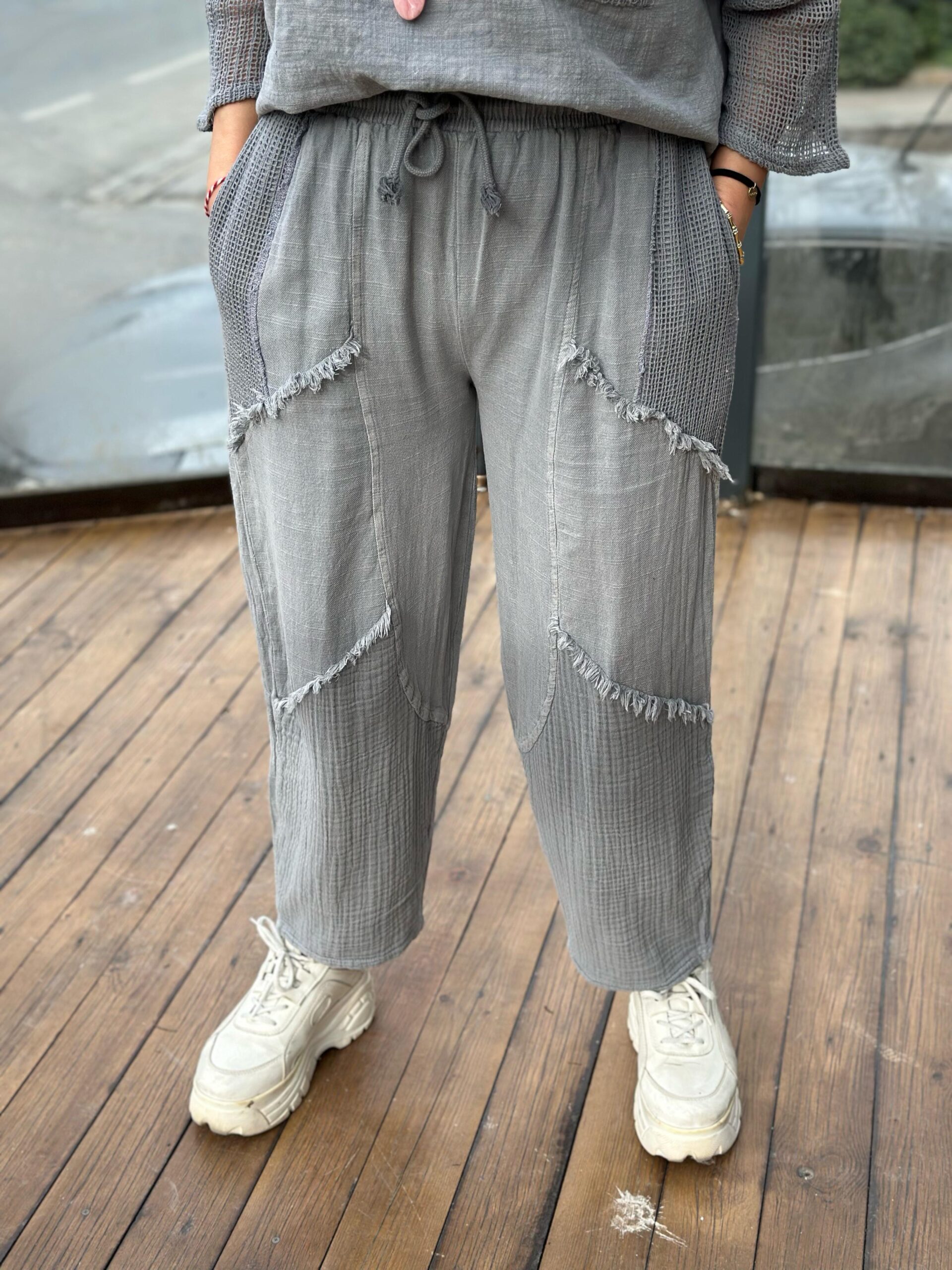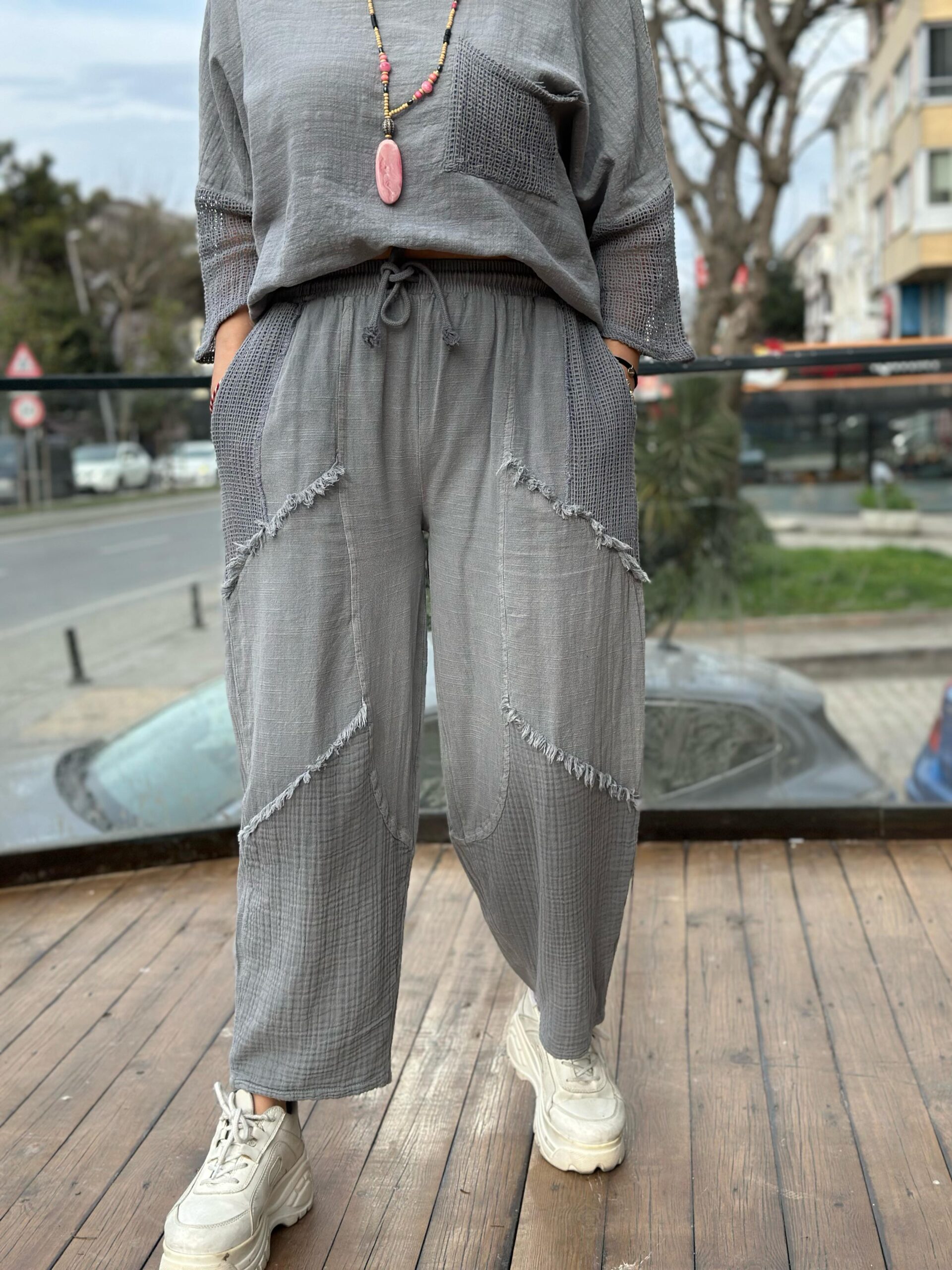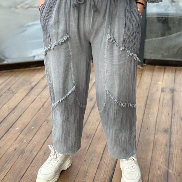 Paça Müslin Detaylı Gri Pantolon